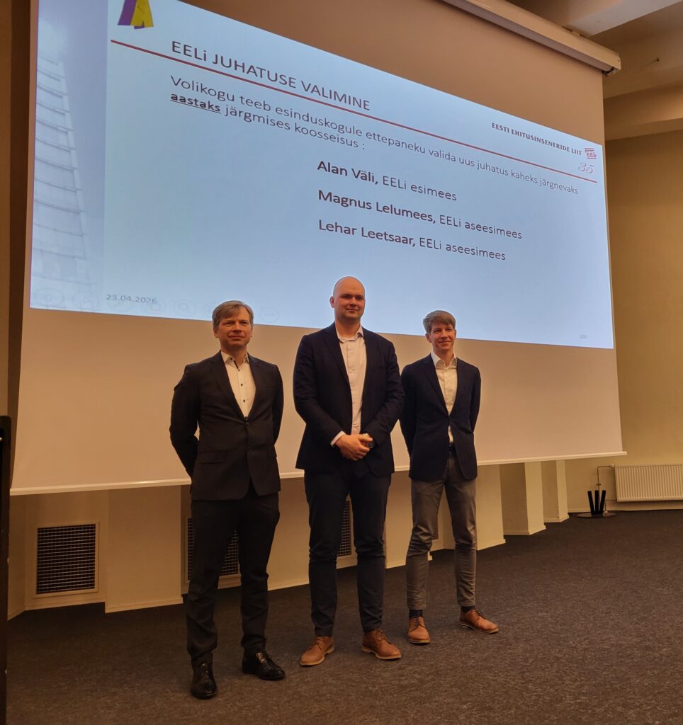 Eesti Ehitusinseneride Liit valis 23.04.2026 toimunud esinduskogul järgmiseks kaheks aastaks uue juhatuse ja volikogu. Juhatusse kuuluvad Alan Väli (esimees) ning Lehar Leetsaar ja Magnus Lelumees (aseesimehed).